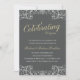 Une invitation élégante pour votre fête d'anniversaire de mariage d'or. Le texte indique "Célébration de 50 ans" dans une écriture dorée élégante sur un fond gris charbon. De belles volutes gris clair le long du haut et du bas du cadre de l'invitation encadrent le texte.