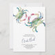 Cette invitation de thème de fête de fruits de mer amusants comporte les mots Cuisson de crabes dans une typographie de script manuscrit élégant avec les détails de l'événement dans une police serif grise charbon classique sur un fond blanc croustillant. Ma peinture originale de crabe à l'aquarelle dans des nuances de rouges, de bleus et de verts orne l'avant. La carte d'invitation se retourne en une couleur bleu marine complémentaire. Un choix chic côtier mais balnéaire pour une cuisson décontractée de basse country, une fête du 4 juillet et des réunions de famille. Pour voir plus de créations de Victoria Grigaliunas, visitez DoTellABelle sur Zazzle.