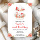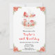 Cette invitation d'anniversaire élégante et festive comprend un stand de gâteaux avec des biscuits de pain d'épices, des macarons, des bonbons, du cacao chaud et une théière. Dans les coins sont de belles fleurs de poinsettia rouges. Le texte combine écriture manuscrite et polices sans serif pour un look élégant et moderne. C'est parfait pour un brunch de Noël d'anniversaire ou une fête du thé.