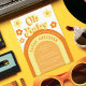 Une invitation à une fête prénatale rétro dans des tons orange et jaune, avec un arc-en-ciel et des polices funky avec un effet de texte ombré rétro pour le titre.
