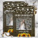 Joli tournesol, bois de grange rustique et lumières douces et blanches scintillantes avec une photo du diplômé, et la formulation moderne blanche.
