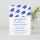 Des invitations minimalistes à des soirées de remise de diplômes avec des casquettes en mortier bleu qui tombent, et un modèle de texte moderne qui est facile à personnaliser. Personnalisez l'invitation de la fête de remise de diplômes en ajoutant le nom du diplômé, le nom de l'école et l'année de remise de diplômes. L'invitation inverse pour afficher les détails de votre fête de remise de diplômes avec un arrière - plan blanc et bleu.