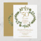 Avec une élégante guirlande de verdure boisée, cette invitation chic et botanique de fête surprise pour les 50 ans de mariage peut être personnalisée avec vos informations spéciales d'anniversaire de mariage en or. Le verso présente une guirlande assortie encadrant les dates d'anniversaire en texte blanc élégant sur fond or. Conçu par Thisisnotme©