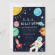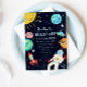 Carte de modèle de fête d'anniversaire pour enfant mignonne pour la fête d'espace de votre enfant. Cette carte présente différentes planètes dans la galaxie avec étoiles, astronaute, OVNI, fusée. Le texte en haut dit : "3...2...1... BLASSEZ-VOUS." Idéal pour la fête d'anniversaire d'un garçon.