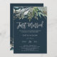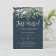 Ces invitations élégantes et minimalistes pour brunch d'après-mariage présentent une verdure à l'aquarelle tendance et des feuilles botaniques sur un fond bleu marine avec un script manuscrit argenté moderne qui dit "juste mariés".