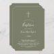 Cette invitation minimale de baptême vert foncé feuille est parfaite pour un baptême bébé boho. Le design se compose d'une simple silhouette de feuille de verdure en vert d'olivier, au style bohème minimaliste de montagne.