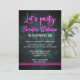 Invitation néon rose vif cool et lumineuse pour les fêtards. Typographie rose, blanche et feuilles de feuillage vert sombre.