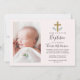 Impression de feuilles d'eucalyptus d'aquarelle simple et douce avec une croix de couleur or, arrière - plan pastel rose vif, et typographie de script moderne design baptism. Cette invitation présente la photo de votre enfant sur le devant de la carte. Ce design rustique vert et rose sauge est parfait pour cette occasion religieuse spéciale.