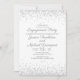Invitation de fiançailles moderne et élégante en blanc avec parties scintillant argent et une police de script cursive.