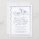 Cette invitation de fiançailles est basée sur la tendance populaire dessinée à la main qui propose des plats et des boissons de style français ou italien dans un style fantaisiste, gribouillant, doodle. Il présente des illustrations dessinées à la main d'un vase de fleurs, de gâteaux, de tasses et de soucoupes, de bougies et d'une théière. Ce design est en bleu et blanc.