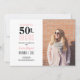 Une invitation carte photo élégante, moderne, 50e anniversaire que vous pouvez personnaliser et envoyer pour votre fête du cinquantième anniversaire. L'expression "50 and Fabulous" est axée sur la carte. Remplacez l'exemple d'image par une image de votre choix. Les couleurs de texte rose et noir peuvent être modifiées à l'aide du menu d'édition. Un motif de chevron rose et blanc géométrique est placé à l'arrière de la carte. Autres motifs et couleurs disponibles.