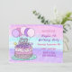Cartes d'invitation pour l'anniversaire d'une fille avec gâteau d'anniversaire dessiné à la main et ballons rose et violet fantaisistes.