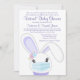 Invitations de douches pour bébé virtuel fille avec adorable lapin lapin lapin bébé portant masque sur un arrière - plan lavande pourpre point. Cette invitation par baby shower mail est facilement customisée avec vos détails d'événement.