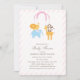 Cette invitation de baby shower comporte un mobile animal de safari sur un arrière - plan rayé très rose-clair. Conception de ©Blackleaf de graphiques.