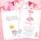 Cette adorable invitation de baby shower présente un ours koala fille en train d'être piloté par des ballons avec un script élégant et du texte moderne pour vos détails. Le dos comporte un ours koala tenant un ballon et un texte pour une demande de livre, ou peut être supprimé pour un regard propre. Facile à customiser en cliquant sur "Personnaliser".