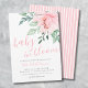 Baby in Bloom Rose Girls Baby shower Invitation. Cette invitation chic et moderne présente "Baby in Bloom" en haut en élégante typographie de script, avec le reste du texte présenté dans un mélange de calligraphie de script et une police serif classique. Le design associe les polices rose et noire pour un look élégant. Une adorable fleur rose vif à l'aquarelle mêlée de feuillage vert apporte une touche de nature et d'élégance. Cette invitation est parfaite pour le printemps et l'été, mais elle peut même passer à l'automne et à l'automne ! Au fond, des rayures roses et blanches, que l'on customise à n'importe quelle couleur selon son thème. Célébrez la mère à être avec cette belle et polyvalente invitation. Disponible sous forme d'invitation imprimée ou d'invitation numérique téléchargeable que vous pouvez envoyer par e-mail ou avoir imprimé localement !