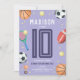 Ce design d'invitation anniversaire de enfant, mignon et moderne, sur le thème du sport, présente un dessin animé de sport violet, avec un ballon de basket, de football, de football, de raquette de tennis, un trophée et des étoiles. L'invitation peut être personnalisé avec le nom de vos filles et d'autres détails nécessaires à votre fête. L'addition sportive parfaite à la fête d'anniversaire de votre enfant ! Cette invitation est prévue pour un 10ème anniversaire, mais il est facile de modifier sous "personnaliser ce modèle" pour un autre anniversaire.