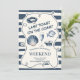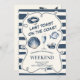 Un design animé, inspiré des marins, aux accents marins, avec des illustrations aquarelles de corde, de coquillages, de poissons, de casquette du capitaine et une boisson pétillante. Les rayures marines audacieuses et la bordure fluide du doodle apportent une touche maritime ludique, parfaite pour une fête de bachelorette côtière ou une soirée maritime.