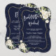 Elégant design de carte avec aquarelle délicate fleurs blanches et feuilles verts, un cadre en faux or, confetti, écriture moderne "BACHELOERETTE WEEKEND" et "DETAILS", sur un arrière - plan bleu foncé. Utilisez l'outil Personnaliser pour ajouter vos informations, modifier les polices, les couleurs de la police. D'autres idées dans ma collection de Bachelorette Party.