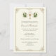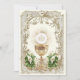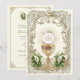 Celebrating the Sacrament of First Holy Communion is a wondrous occasion. This traditional Catholic custom-designed vintage First Holy Communion Invitation features a beautiful image of the Chalice and Host, the Eucharist overlaid on an ornate gold frame, accented with a white floral calla lilies and gold design. All text and fonts can be easily modified.