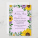 Invitation rustique d'anniversaire de pays avec des tournesols vibrants, des marguerites blanches traditionnelles et des fleurs violettes colorées contre un arrière - plan violet clair avec l'haleine de bébé et des accents de verdure botanique