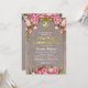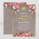 Invitation pour la première sainte communion des filles avec un fond en bois rustique, paillettes dorées dispersées, un beau décor floral aquarelle rose, un titre en or script, une croix religieuse et un modèle de sainte communion facile à personnaliser.