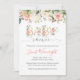 Invitation élégante pour Shower de bébé avec lettres dorées décorées de roses aquarelles roses et pêche contrastant avec des feuilles verdâtres.