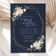 Invitations amis et famille dans le style et donner le ton pour votre journée spéciale avec ce faire-part de mariage charmant. Le design présente des fleurs d'aquarelle blanche, de la verdure et un cadre doré sur arrière - plan bleu marine.
