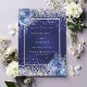 Un arrière - plan bleu marine aux couleurs irrégulières décoré de roses bleus, de fleurs et de faux confettis argentés. Personnalisez et ajoutez vos noms et les détails du mariage. Lettres noires.