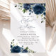 Invitations amis et famille dans le style et donner le ton pour votre journée spéciale avec cette charmante invitation d'anniversaire. Le design présente des fleurs d'aquarelle bleu marine et de la verdure sur l'arrière - plan blanc.