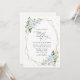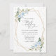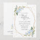 Invitations amis et famille dans le style et donner le ton pour votre journée spéciale avec ce faire-part de mariage charmant. Le design présente des fleurs d'aquarelle bleu et blanc, de la verdure, des confettis dorés et un cadre doré sur un arrière - plan blanc.
