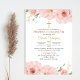 Invita a tus seres queridos a compartir esta ocasión sagrada con esta elegante invitación que presenta délicadas flores de color durazno y un encantador maladie de cruz. Perfecta para celar una primera comunión rodeada de familiares y amigos. Disponible en español. Invitation vos proches à partager dans cette occasion sacrée avec cette élégante invitation faite de fleurs délicates couleur pêche et d'une charmante croix design. Parfait pour célébrer une première communion sainte entourée de famille et d'amis. Disponible en espagnol.