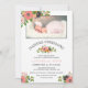Invitation à une cérémonie de dénomination avec des bouquets de fleurs roses, rousses, orange et noires et une photo de votre belle petite fille. Le dos est orné d'un motif de confettis blancs.