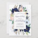 Cette invitation à la fiançailles mariage design et branchée présente un cadre rectangulaire moderne avec des fleurs d'aquarelle de couleur marine. Les fleurs d'hydrangée, de pivoine et d'anémone apparaissent dans les tons bleu marine, bleu clair et rose vif avec des feuilles beiges verts et neutres, ainsi que des étoiles de mer. Le arrière - plan de la carte est décoré d'une aquarelle bleu pâle et de éclaboussures, et le dos de l'invitation est bleu marine foncé.