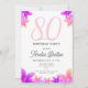 Elégante florale rose 80e anniversaire de fête Invitation pour les femmes. Célébrez un jalon dans le style avec cette élégante invitation de 80e anniversaire avec des fleurs de couleur douce à l'aquarelle en roses, violets et oranges vibrantes. Conçu avec un script raffiné et une mise en page moderne, ce modèle personnalisable est parfait pour honorer une femme spéciale avec un rassemblement intemporel et gracieux. Personnalisez avec vos détails de l'événement et les infos RSVP pour créer l'invitation parfait pour une célébration mémorable.