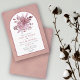 Cette faire-part de mariage pour une fête estivale présente une charmante arche encadrée sur un fond de rose rose poussiéreux et taché. Le design est agrémenté de belles fleurs dahlia et roses, accompagnées de feuillage et d'herbe pampas dans des tons variés de rose rose poussiéreux.