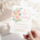 Fleurs violettes première invitation pour bébé avec eucalyptus vert feuilles et roses d'eau rose buisson et couronne dorée