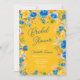 Elégant printemps moderne pays été fleurs bleues et jaunes peint à la main aquarelle illustration avec jolie fleur sauvage et brush script douche nuptiale avec une typographie calligraphie moderne, parfait pour les thèmes méditerranéens, italiens, européens de la mer sur moutarde jaune foncé.