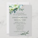 Elégante faire-part de mariage rustique inspirant, présente un design floral simple aquarelle avec de belles fleurs bleues, blanches et ivoire agrémentées de feuilles et des éclats d'or et de verdure turquoise avec un arrière - plan gris. L'introduction présente la Bible Verse Chanson de Salomon 3:4, "J'ai trouvé celui que mon âme aime."