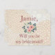 Demandez à vos amis d'être votre demoiselle d'honneur en utilisant cette belle carte postale. "Floral Bridesmaid invitation" présente un bel arrière - plan floral chic aux fleurs beiges. Le texte est écrit en bordeaux. Le nom est écrit en imprimé, avec un bouquet de fleurs vert, bleu et pêche en dessous. "Serez-vous ma demoiselle d'honneur est écrite en bas. Arrêtez-vous et faites vos courses aujourd'hui ! Conception de l'invitation : WeddingsbyRhoadie Papier floral arrière - plan : Prettygrafik design (https://www.etsy.com/shop/Prettygrafikdesign) Clipart florale : AMBillustrations http://www.etsy.com/shop/AMBillustrations/