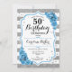 Elégante invitation au 50e anniversaire, fleurie et féminine avec votre photo au verso de la carte. Blanc glam, bleu aqua poussiéreux design avec faux argent parties scintillant. Comprend des rayures, des roses turquoise bleu clair, des caractères de script et des confettis. Parfait pour une fête anniversaire adulte élégante. Personnalisez avec vos propres détails. Peut être customisé pour n'importe quel âge ! Invitations Zazzle imprimées ou téléchargement instantané modèle imprimable numérique.