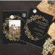 Cadre géométrique floral noir et or avec une photo personnalisée à l'arrière.