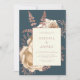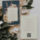 Cette élégante invitation au mariage présente un bouquet luxuriant et romantique en ivoire avec fausse feuille d'or rose et feuillage de parties scintillant sur un arrière - plan turquoise foncé. Customisez le texte rose rose dans des polices de style sur un rectangle en ivoire. L'envers offre de l'espace pour les détails mariages sur un arrière - plan en ivoire solide, ainsi qu'un code QR que les clients peuvent scanner pour visiter votre site Web et RSVP, ce qui permet d'économiser le coût d'impression et d'envoi de cartes RSVP séparées.