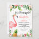 Invitation d'anniversaire Flamingle Flamingle Colorful Let's flamingle invitation d'anniversaire avec un grand flamant, feuillage et fleurs topiques et un ananas. Le design comprend également un ballon en forme de coeur.