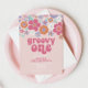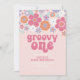 SUPER ! Retro inspiré invitation 1er anniversaire avec des polices et des couleurs de style 70's, Floral dans les couleurs vives rose et violet.