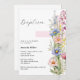 Arrière - plan blanc, avec une grande croix rose ornée de fleurs roses et bleues. Personnalisez et ajoutez le nom et les détails.