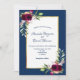 Sur le devant : Un arrière - plan bleu marine avec un faux cadre doré et blanc. Décoré de fleurs bordeaux foncé, de roses, de plumes de style boho et de verdure. Modèles pour Vos noms et les détails mariages. Les noms sont écrits avec un script de style écrit à la main, des lettres bleu marine. Retour : arrière - plan bleu marine.