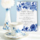 "Floral Asian Influence Blue White Fête des mariées." La disposition standard du texte offre plus de place pour des informations d'invitation plus longues. Style chinois vintage bleu et blanc mais nouvel art de l'artiste de renommée internationale Audrey Jeanne Roberts. Droit d'auteur .