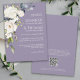 Avec des caractéristiques de faire-part de mariage tout-en-un populaires et une gamme de couleurs nuptiales branchées, ce faire-part de mariage unique dispose d'un bouquet en cascade de fleurs d'aquarelle blanche avec eucalyptus traînant et verdure sur un bel arrière - plan lavande violet. Les fleurs comprennent des roses, des hydrangées et des fleurs mixtes assorties pour un effet agréable. Le verso de l'invitation a un modèle de code QR pour inclure votre site mariage et d'autres informations pour vos invités. Ils peuvent vous envoyer votre demande directement sur votre site Web pour plus de commodité. Les appariements de texte utilisés dans ce design présentent les noms de mariée et mariée en utilisant une police serif élégante dans le coque supérieur associée à une autre police serif populaire. Personnalisez le modèle de texte facile à utiliser avec vos détails de mariage.