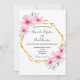 Un élégant faire-part de mariage tropical d'été. Avec un cadre géométrique en faux or décoré d'hibiscus rose pâle, fleurissent des fleurs tropicales avec un peu de verdure. Couleur arrière - plan blanche. Les noms de mariée et de mariée sont écrits avec un script de style moderne et artisanal. Texte noir. Retour : motif de verdure en tant qu'arrière - plan